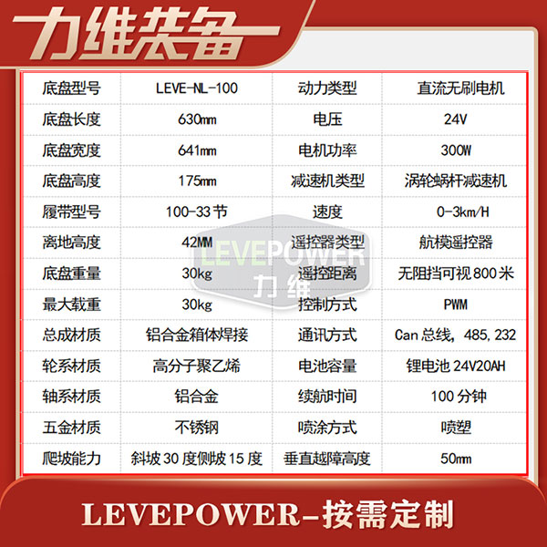 橡膠履帶底盤長630mm,橡膠履帶寬641mm,橡膠履帶高175mm,PWM航模遙控器控制,通信方式Can總線,232,485,橡膠履帶機(jī)器人功能強(qiáng)大,用途廣泛。特種履帶底盤動力采用箱體采用鋁合金材質(zhì)焊接而成,防腐性能好。越野履帶底盤動力采用24V300W直流無刷電機(jī),渦輪蝸桿減速機(jī)動力更強(qiáng),轉(zhuǎn)彎靈活。橡膠履帶底盤電池采用24V20AH鋰電池,續(xù)航時間更長,是一款不錯的機(jī)器人橡膠履帶。