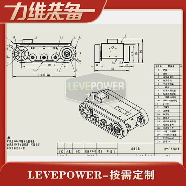 履帶底盤長(zhǎng)900mm,履帶底盤寬460mm,履帶底盤高280mm,無線遙控履帶底盤箱體采用鋁合金材質(zhì)焊接而成,防腐性能好。履帶底盤動(dòng)力采用48V750W直流無刷電機(jī),渦輪蝸桿減速機(jī)動(dòng)力更強(qiáng),轉(zhuǎn)彎靈活。履帶底盤電池采用48V20AH鋰電池,續(xù)航時(shí)間更長(zhǎng),是一款不錯(cuò)的機(jī)器人橡膠履帶。