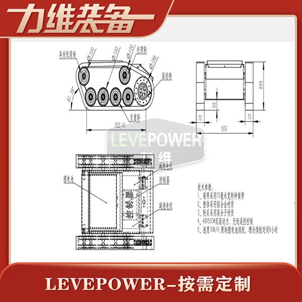 履帶底盤長700mm,履帶底盤寬500mm,履帶底盤高255mm,無線遙控履帶底盤箱體采用鋁合金材質(zhì)焊接而成,防腐性能好。履帶底盤動(dòng)力采用48V500W直流無刷電機(jī),渦輪蝸桿減速機(jī)動(dòng)力更強(qiáng),轉(zhuǎn)彎靈活,爬坡性能穩(wěn)定。履帶底盤電池采用48V50AH鋰電池,續(xù)航時(shí)間更長,是一款不錯(cuò)的機(jī)器人橡膠履帶。