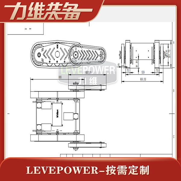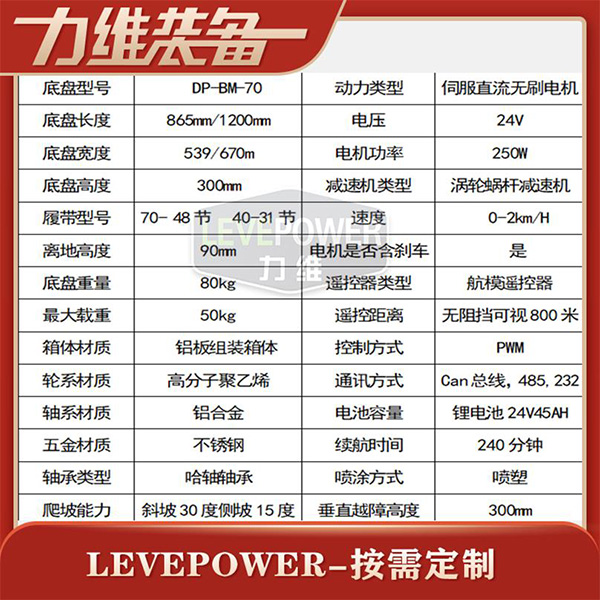 該底盤主體履帶使用100mm寬耐磨橡膠履帶,外花紋橫紋設(shè)計,提高攀爬能力。擺臂履帶采用40mm寬度機器人橡膠履帶,底盤箱體經(jīng)過高溫噴砂噴塑防銹處理,主題底盤采用2個24v200w伺服直流無刷電機,擺臂采用1個24v200w伺服直流無刷電機,渦輪蝸桿減速機,可載重50kg,是一種操控既方便,有實用的底盤系統(tǒng),在不平坦的路面,爬坡,越障非常好用。是一款全地形底盤。電池采用24v45ah磷酸鐵鋰鋰電池,持續(xù)續(xù)航時間可達4個小時長時間續(xù)航。