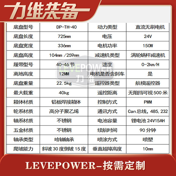 特種橡膠履帶盤使用寬40mm的耐磨橡膠履帶,底盤框架經(jīng)過高溫噴砂噴塑防銹處理,可載重200kg,是一種操控既方便,有實(shí)用的專業(yè)底盤系統(tǒng).合理的設(shè)計(jì),越野性能更強(qiáng)。在不平坦的路面,爬坡,越障非常好用。是一款全地形底盤,行駛速度15千米每小時(shí)左右。